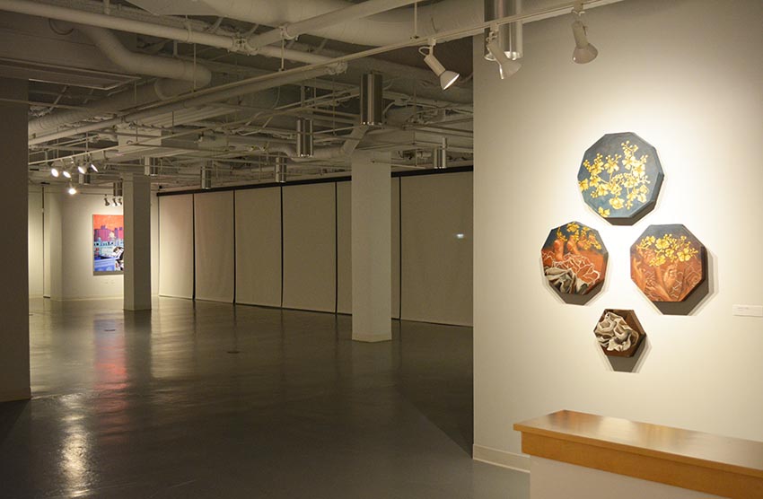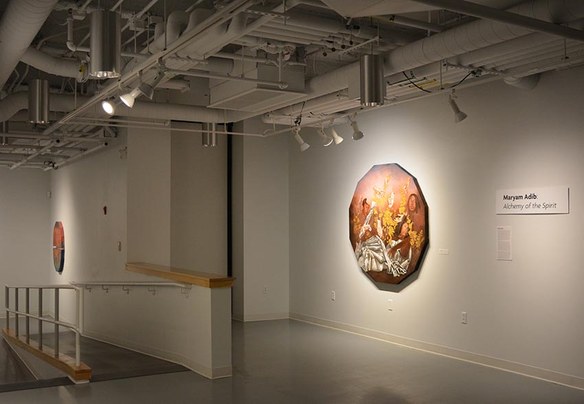 From left: East gallery: Maryam Adib, “Abiding Echoes”, 2020, Acrylic on canvas, 36 x 24 inches; Central gallery: Maryam Adib, “Catalyst”, 2020, Oil on Canvas, 60 x 60 inches.