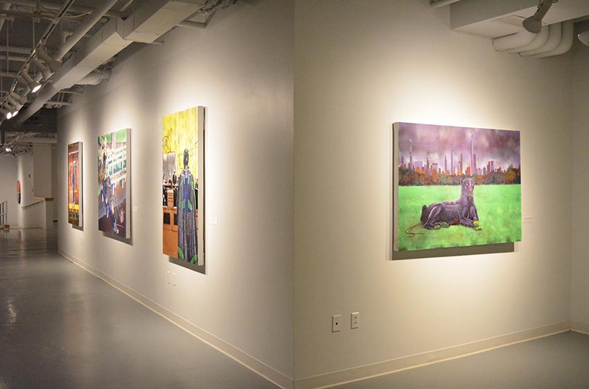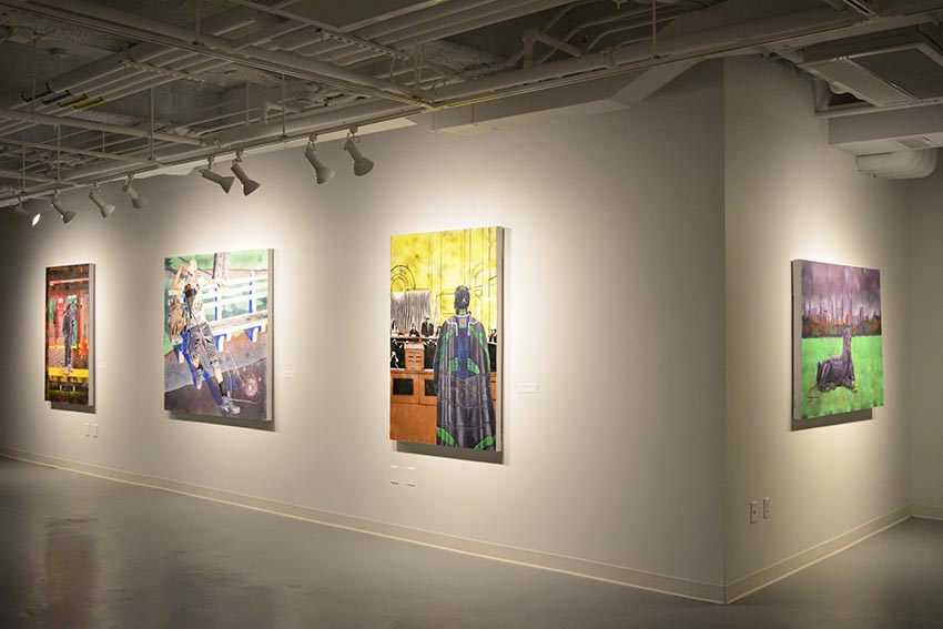 Central gallery: From left: Darien Fernandez, “Royal Company”, 2020, Spray paint and oil on canvas, 56 x 38 inches; East gallery: Maryam Adib, “Abiding Echoes”, 2020, Acrylic on canvas, 36 x 24 inches; Darien Fernandez, “Waiting 4 The Express”, 2020, 38 x 56 inches, Spray paint and oil on canvas; Darien Fernandez, “Social distancing”, 2020, 54 x 60 inches, Spray paint and oil on canvas; Darien Fernandez, “Lord Doernbecher”, 2020, 56 x 38 in, Spray paint and oil on canvas.