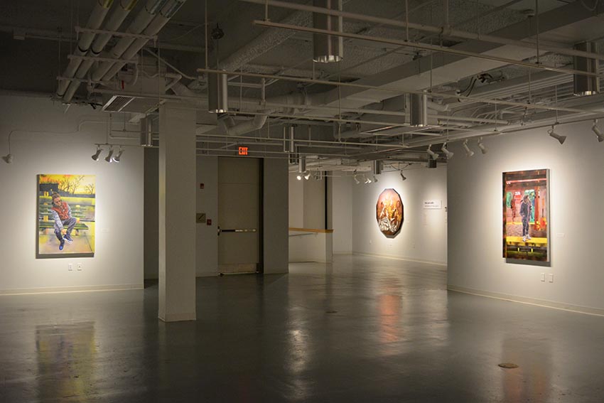 Central gallery: From left: Darien Fernandez, “Royal Company”, 2020, 56 x 38 inches, Spray paint and oil on canvas; East gallery: Maryam Adib, “Abiding Echoes”, 2020, Acrylic on canvas, 36 x 24 inches; Darien Fernandez, “Waiting 4 The Express”, 2020, 56 x 38 inches, Spray paint and oil on canvas.