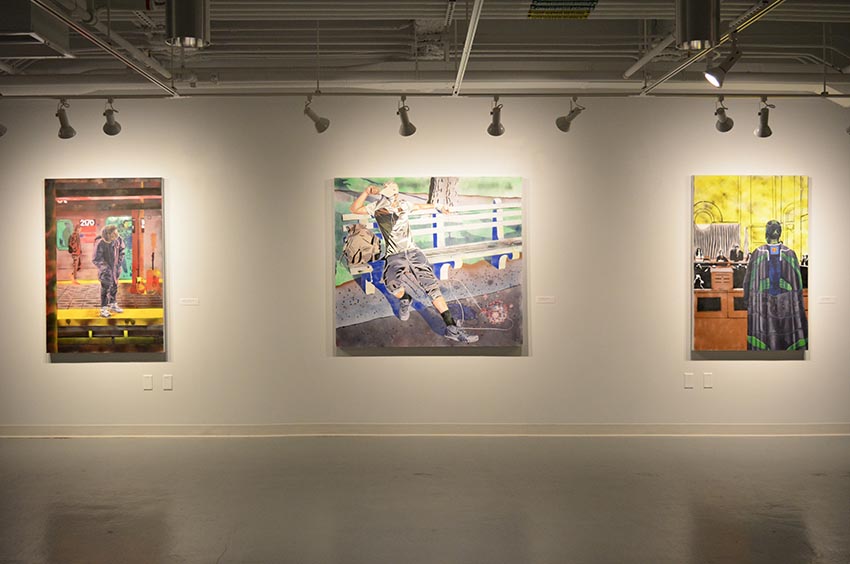 Central gallery: From left: Darien Fernandez, “Waiting 4 The Express”, 2020, 56 x 38 inches, Spray paint and oil on canvas; Darien Fernandez, “Social distancing”, 2020, 54 x 60 inches, Spray paint and oil on canvas; Darien Fernandez, “Lord Doernbecher”, 2020, 56 x 38 in, Spray paint and oil on canvas.