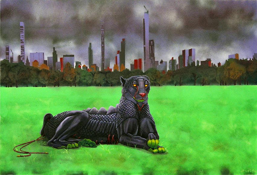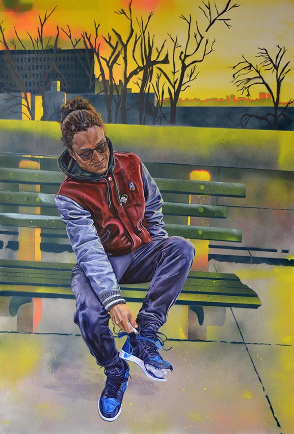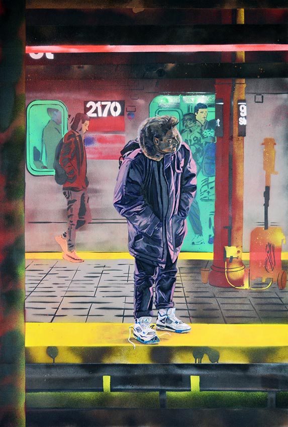 Darien Fernandez, “Waiting 4 The Express”, 2020, 38 x 56 inches, Spray paint and oil on canvas.