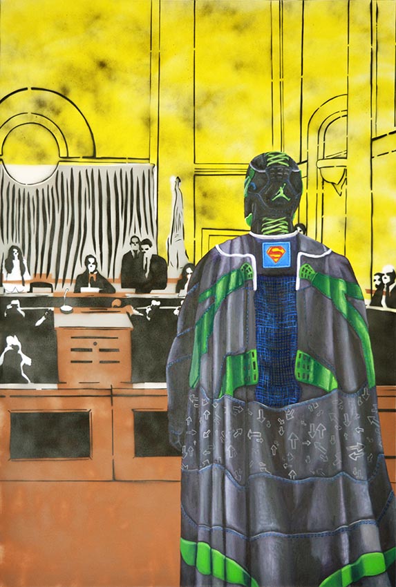 Darien Fernandez, “Lord Doernbecher”, 2020, 38 x 56 inches, Spray paint and oil on canvas.