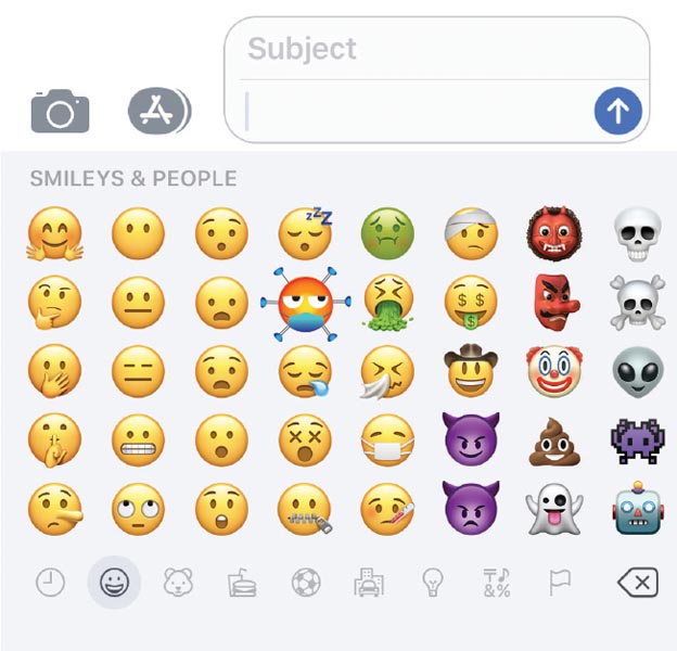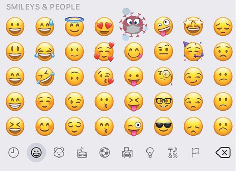 This is an emoji representing the Covid molecule itself, at risk. Surrounded by the factors used to kill off Covid (such as a face mask and soap suds), the molecule is looking nervous and is sweating as it is getting killed off.