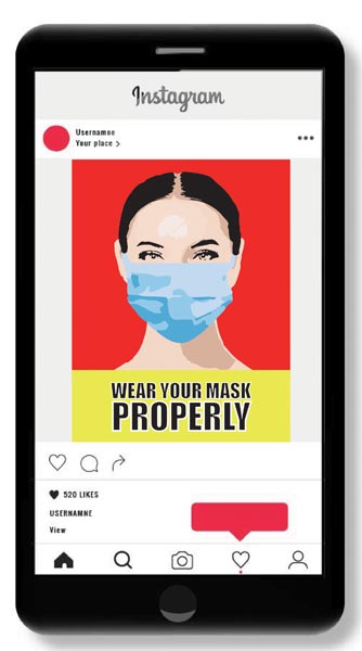 My design promotes wearing a mask to protect against the coronavirus. In context, the design would be displayed as a large sticker on entry and exit points in buildings placed eye level on the door.