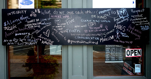 The wall’s purpose is to facilitate a community dialogue about democracy and economic inequality, according to organizers. People walking by the 7.5-foot long blackboard are asked to write a personal response to its question in colored chalk. Recently, the question was posed: “What do we owe each other?” Responses included equality, dignity, fairness and patience.