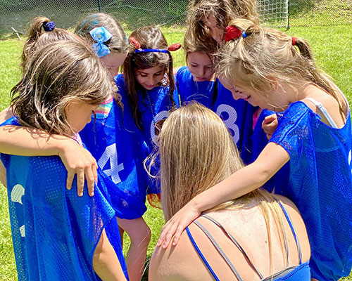 Motivating a girls soccer team with her back to the camera as a sport specialist at summer camp Ramaquois