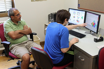 | Jubran, left, and Metcalf, right, discuss their research during a recent meeting. |