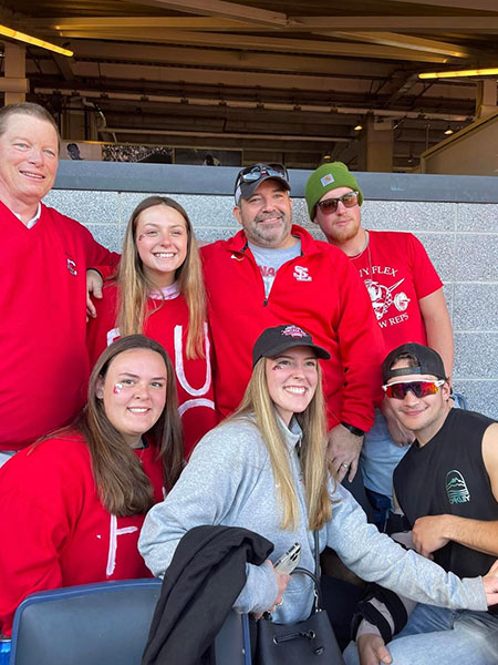 Dann at 2022 Cortaca Jug at Yankee Stadium with, front row, Katelyn Gay ’24, Madelyn Gay ’24 and Braden Ryan; and back row, Mark Farmer ’83, Nora Glover ’24, Dann and Jackson Hunt-Lamb